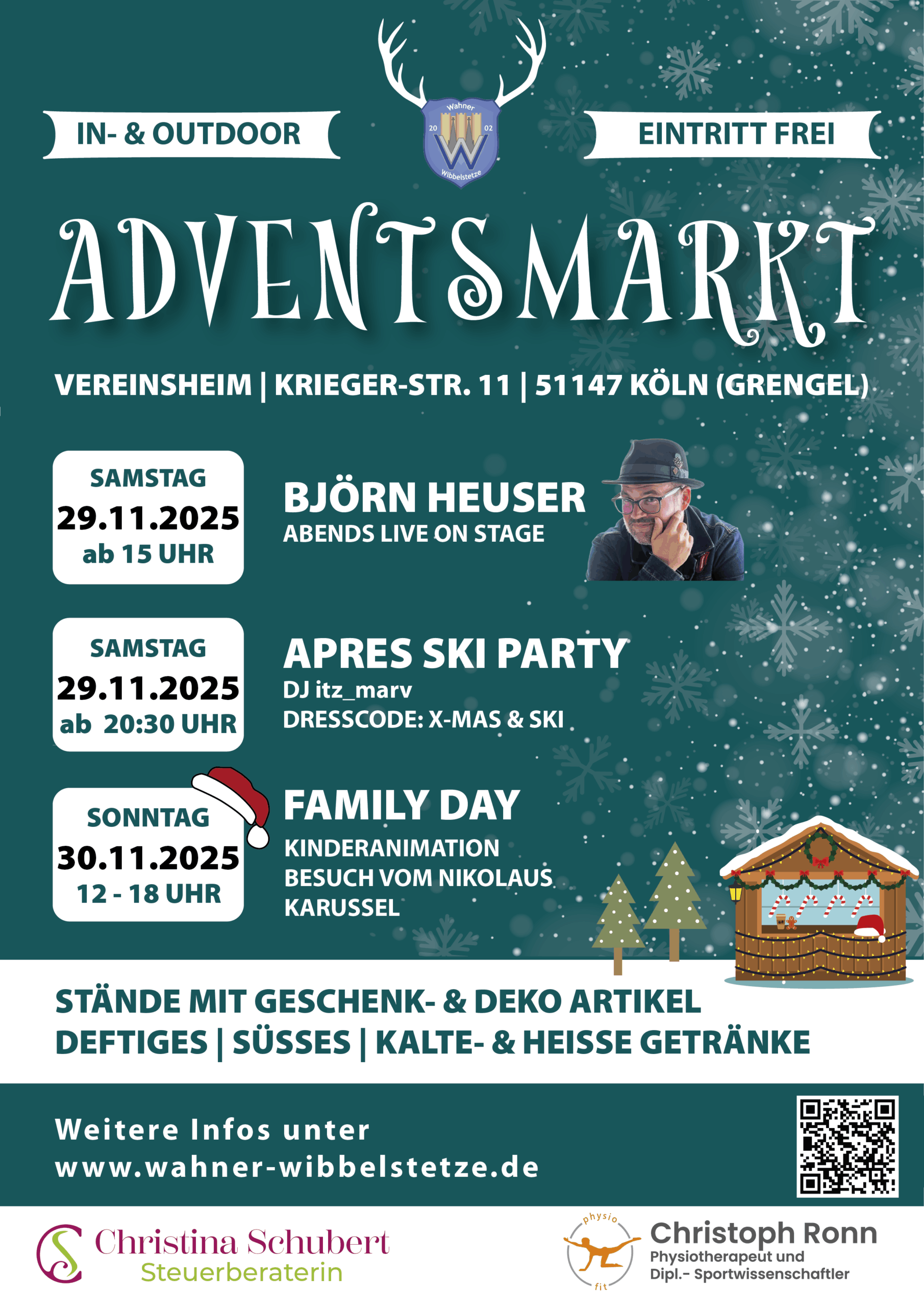 Zur Weihnachtszeit wird es bei uns gemütlich: Am ersten Adventswochenende laden wir herzlich zu unserem stimmungsvollen In- & Outdoor-Adventsmarkt im Vereinsheim ein.